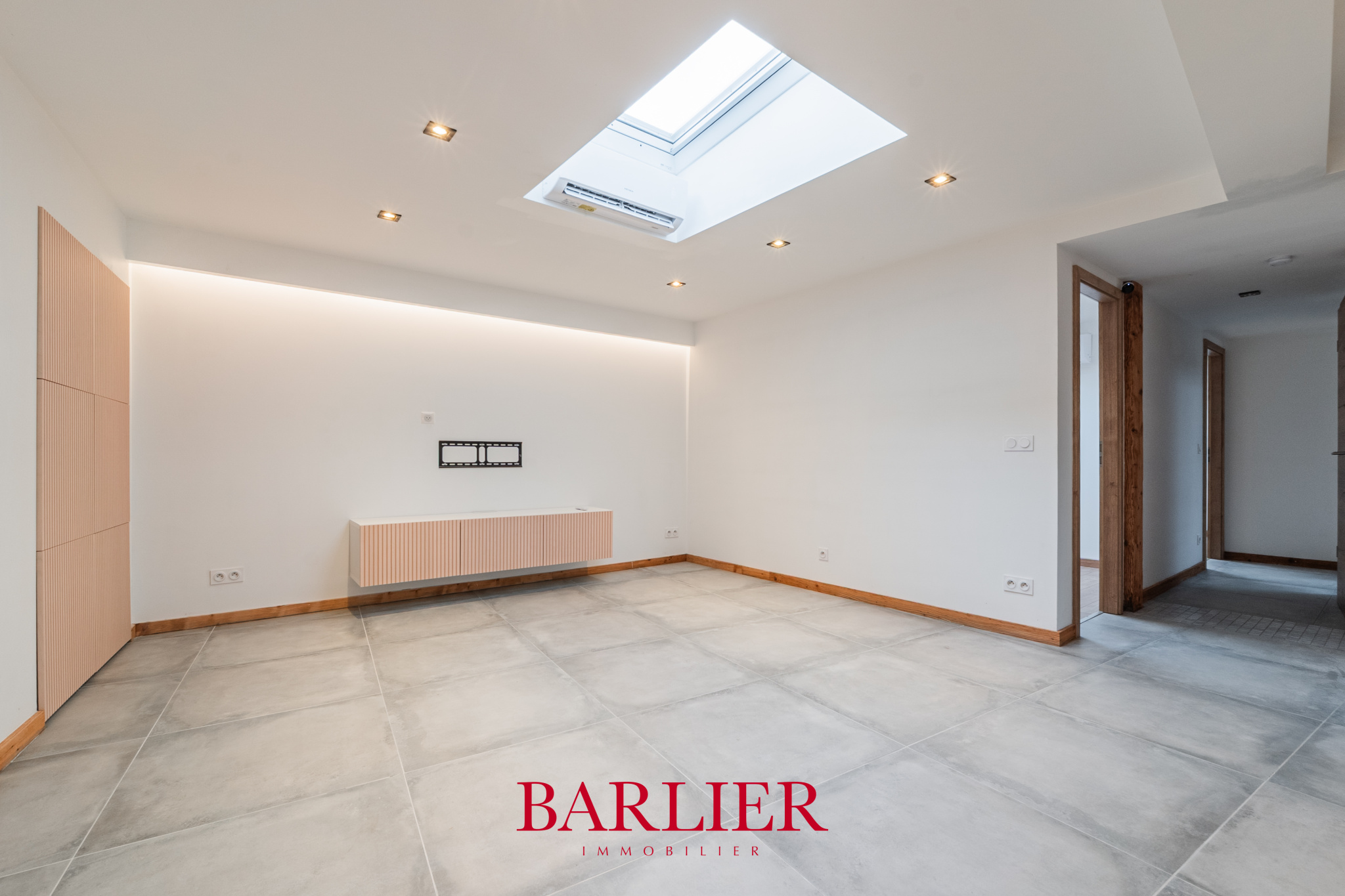 Dès l’entrée, la sensation d’espace s’impose naturellement. La lumière descend d’en haut, guidée par des puits de lumière qui transforment chaque moment de la journée. Le séjour, généreux et lumineux, intègre des rangements sur mesure, discrets et parfaitement intégrés, comme s’ils avaient toujours été là.