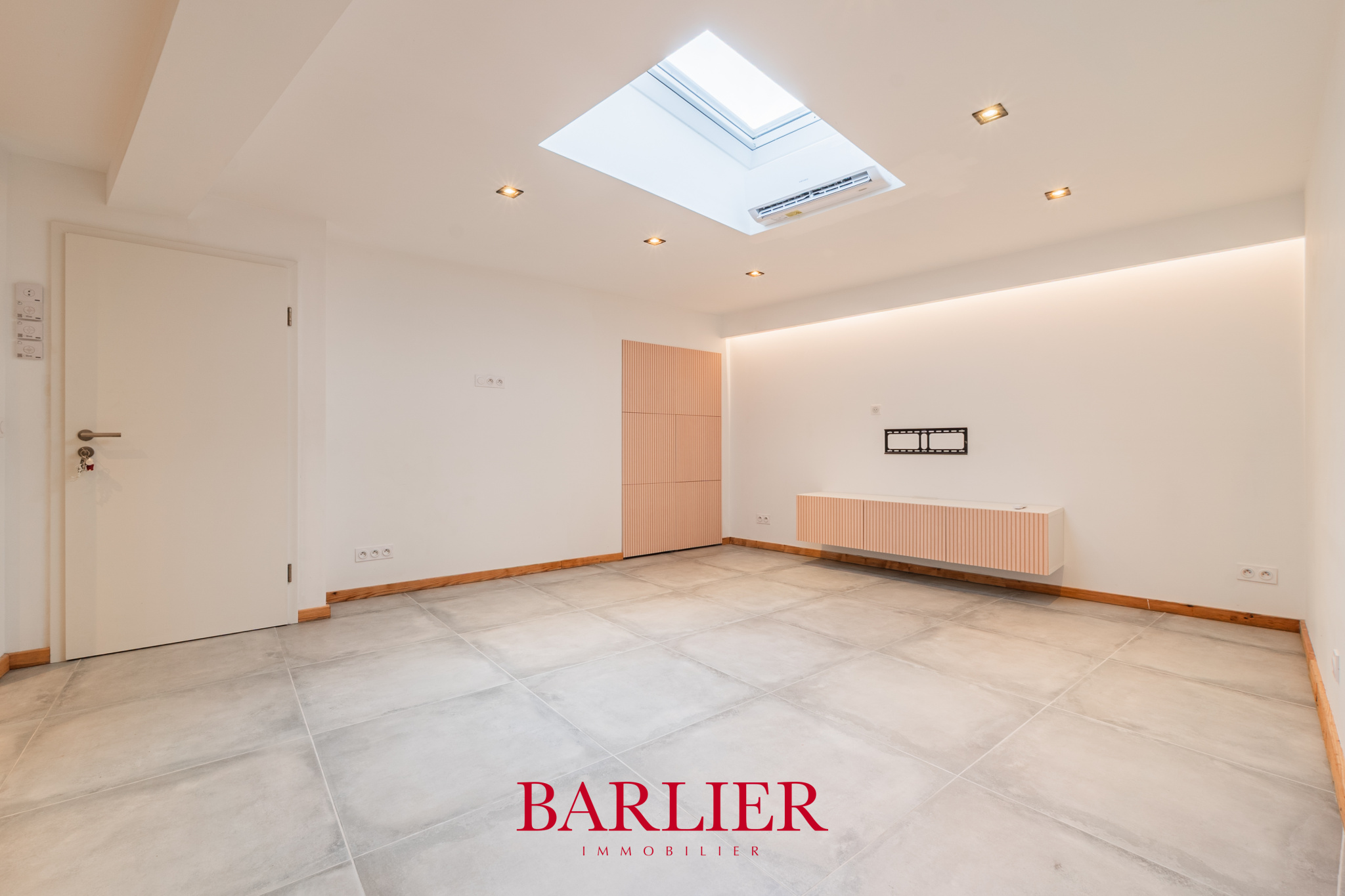 Dès l’entrée, la sensation d’espace s’impose naturellement. La lumière descend d’en haut, guidée par des puits de lumière qui transforment chaque moment de la journée. Le séjour, généreux et lumineux, intègre des rangements sur mesure, discrets et parfaitement intégrés, comme s’ils avaient toujours été là.